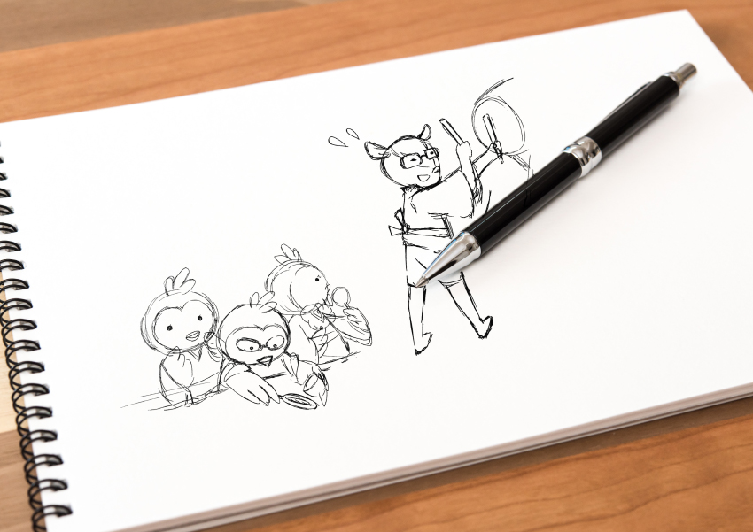 こちらがラフになります。はじめは1号がりんご飴と綿菓子を持っていましたが、3号の方がはお菓子 を持っているキャラクターのため1号を応援。3号にりんご飴を持ってもらいました!