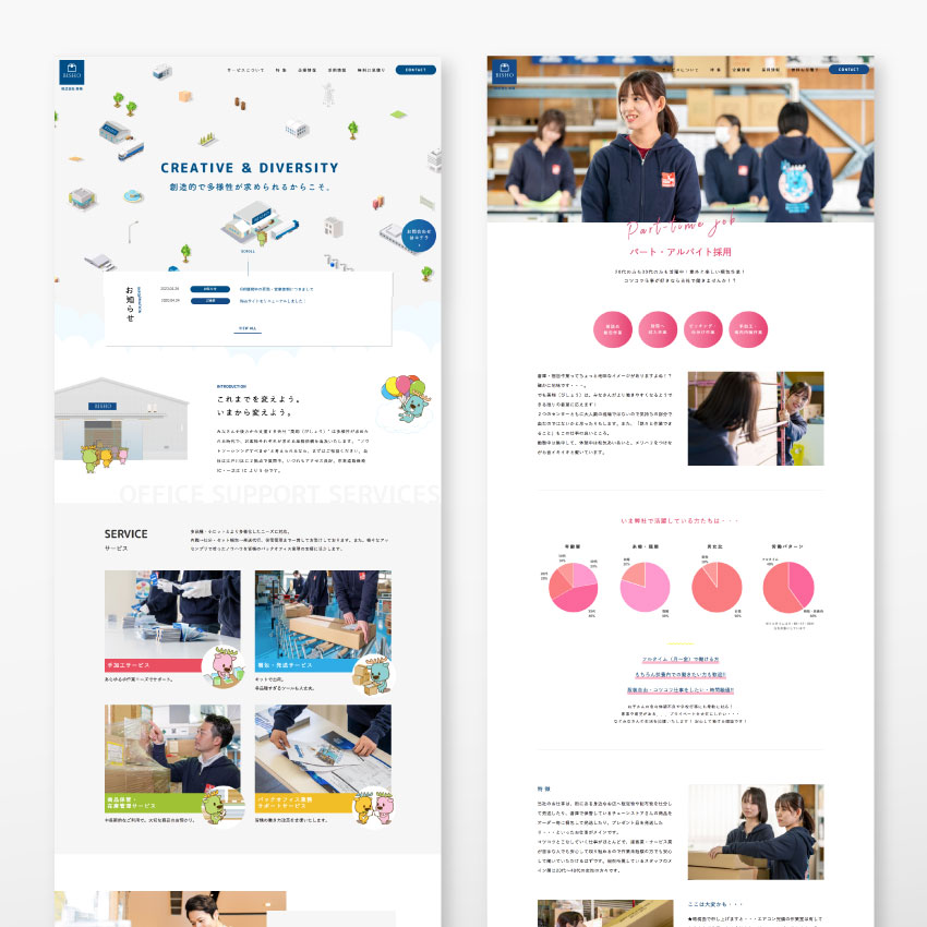 そして本来の制作順序としては逆なのかもしれませんが、一番最後にリニューアルしたのがWebサイトでした。これまでの各種ツールで幅広く展開していたデザインをもう一度整理してデザイン的な指針としてまとめ直すという作業も含めて、それまでのビジネス然としていたコーポレートサイトを明るく楽しげなトーン&マナーで仕上げています。イラストやキャラクターでは伝わりづらい社内風景や職場環境、作業現場などは費用をかけてきちんと撮影することでフリー画像素材とは一線を画すものとなり、会社紹介や採用シーンなどで特に有効な素材となると思っています。