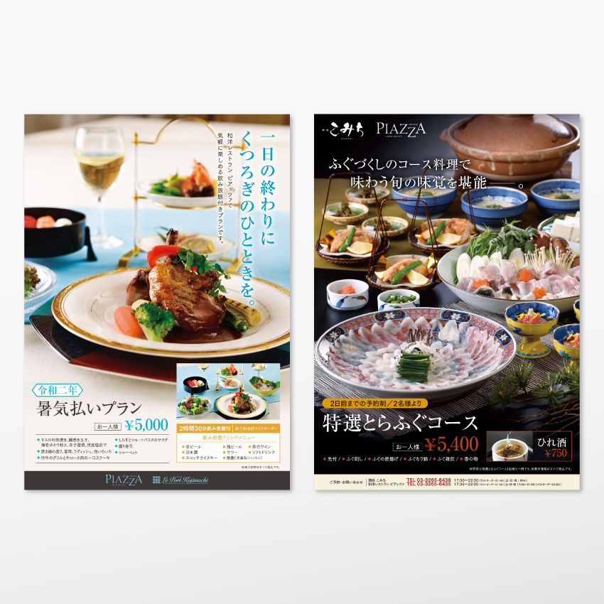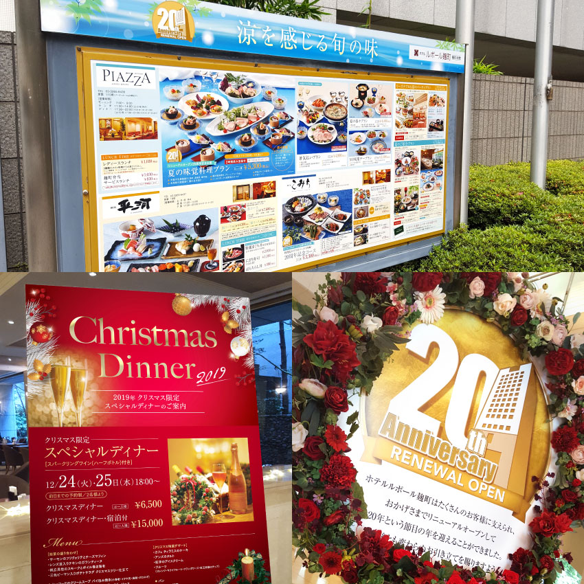 こういったホテルでの仕事というのは勤めていた頃もやったことがありますが、パンフレットのデザインが出来てくるとポスターや看板等にもデザインを展開していくのもまた面白いところ。手元で見せるパンフレットのレイアウトと一枚で見せるポスターでは同じ料理でも最適なイメージは異なったりしますし、看板ともなってくると本当にホテルのデザイン全体を手がけているんだな、という実感も出てきます。毎回必ずというわけにもいかなかったりしますが、なるべく手がけたものが実際にどう見えるかを検証しにいくことで、どうしても日頃からMacの前でIllustratorのデータばかり見ていると見えなくなりがちなところを補正したりもします。そういう意味では、パンフレット、チラシ、ポスター、看板と役割の異なるツールが一通り揃っているホテルの案件は、グラフィックデザインにおける見せ方のベースとなるようなものなのかもしれません。