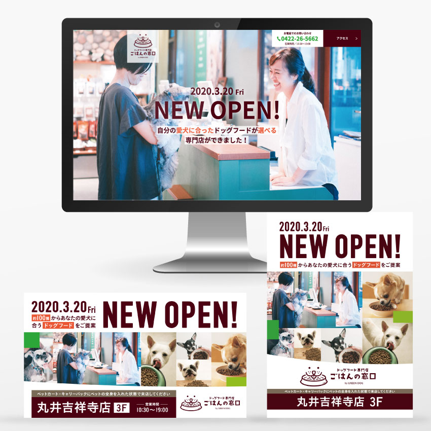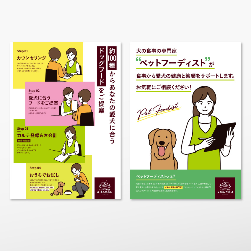 今回のクライアントは「犬と暮らす喜び、健康、笑顔」をテーマにインターネット通販や店舗運営を初めとして、自然食フード・健康食品といったオリジナルブランドの展開や各種セミナーの開催など、人とパートナーである犬たちとの生活をトータルで支えるための様々な事業をトータルに展開しています。長年店舗運営をされている中で、この度ワッカデザインにお声がけいただいたのは、商業ビルに入居するショップでありながらモノを販売せず、カウンセリングに特化した新コンセプトのお店のオープニングツールでした。独立する前は大企業のブランディングショップやイベントのツール制作など数多くこなしていましたが、ワッカデザインも独立・起業してから5年あまりで、ようやくこういった案件のお手伝いができるところまできたかと思うと感慨深いものがあります。