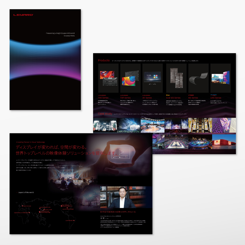 今回のクライアントはイベントやTV業界、店頭ディスプレイ業界などで圧倒的なシェアを誇る外資系ディスプレイメーカー。長引くコロナ禍の中でそれまで使っていた制作会社が事業を縮小することとなったことから、新たな外注先を探してワッカデザインのWebサイトに辿り着いたという経緯ですが、喫緊の課題が会社案内のリニューアルであり、せっかく制作会社を変えるなら合わせて名刺や封筒などあらゆるツールを一新したいというスケールの大きなご依頼でした。