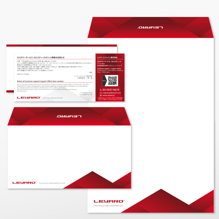 ここまで出来ていると、名刺、封筒といったブランディングツールへの展開のために必要な情報やデザイン的な理解は揃っており、デザインを起こすだけという非常にやりやすい状況でした。言い換えれば、明文化はしていないもののデザイン的なトーン&マナーの策定は完了しているため、ベースとなる考え方や表現の上で作業すれば良いわけです。合わせて一部事業所移転があったため、その関連ツールも一緒にデザインすることになり、運が良かったのもあってわずか2、3ヶ月の間にかなり複合的なデザイン展開ができたと思います。