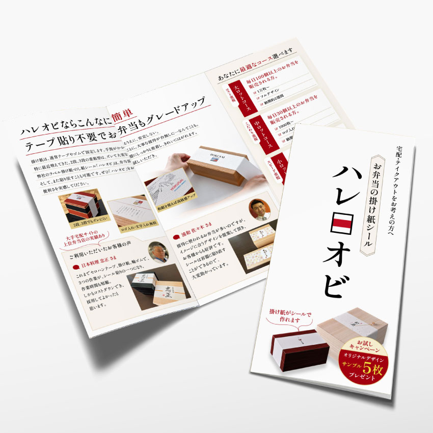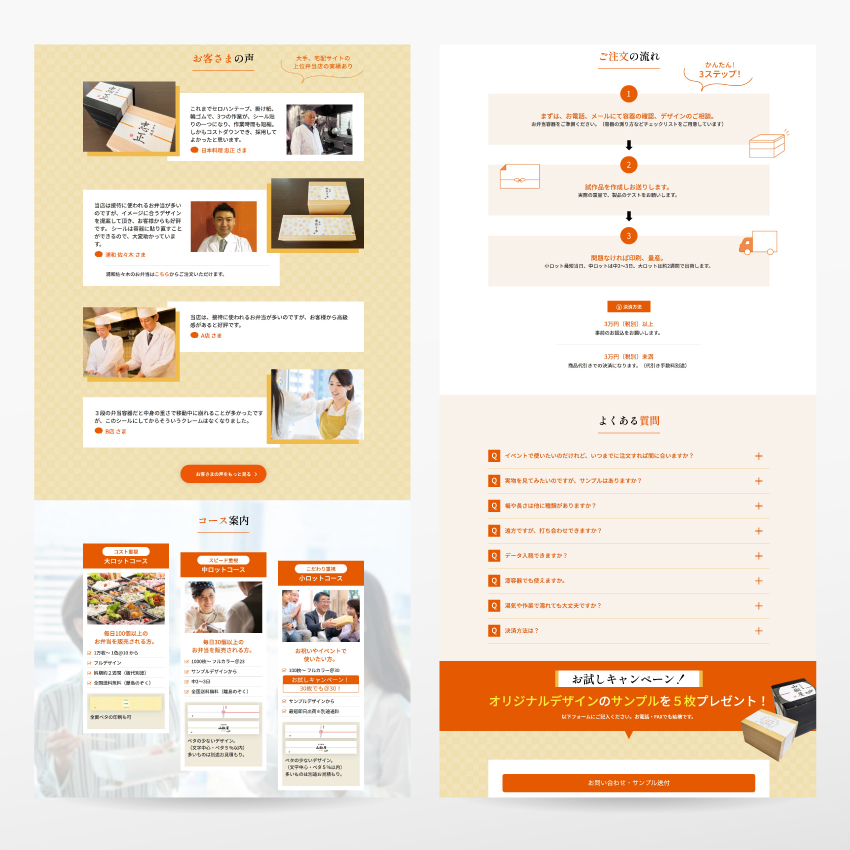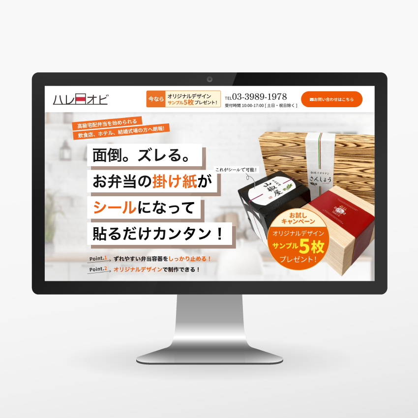 今回のクライアントはワッカデザインと同じ東京都豊島区にあるシール・ラベルのデザインから製作まで請け負う総合商社。創業40年を数え、元々は高度経済成長期にスーパーで使う値札ラベルの商社として創業されたそうで、そこから派生しプリンター、カタログ、パンフレット、封筒、伝票といったように取扱いを増やしてきました。そういった中で新たなビジネス展開としてテイクアウト用のお弁当に貼る掛け紙をシールで作るサービスのランディングページを作りたいとWebサイトからお問い合わせいただいたのがきっかけです。