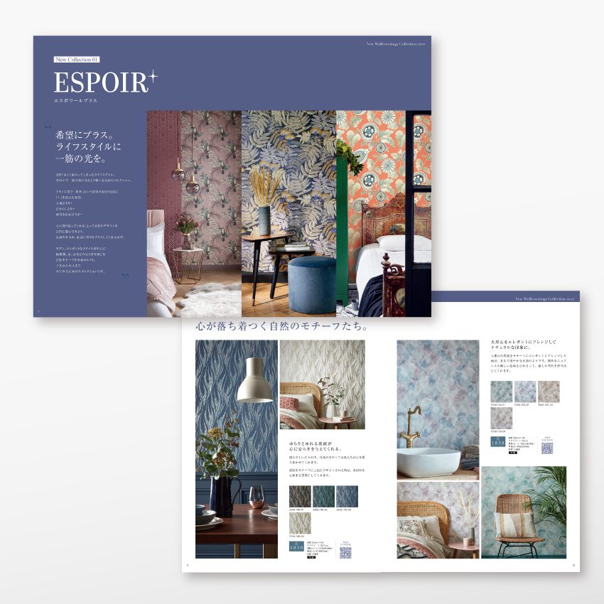今回ご紹介する実例は最近では珍しくなった130ページ超の紙のカタログリニューアル。Webサイトから問い合わせいただいたのですが、長年お願いしている制作会社に思いを伝えてリニューアル提案をしてもらったところ、現行のものとほぼ変わらなかったため、新たに制作会社を探しており、それも100ページ以上の製品カタログは一つの制作ジャンルなので、提案力があって経験もある会社を探しているとのこと。お客様は輸入壁紙の商社のため、同じジャンルの実績はありませんが、BtoB、BtoCともにカタログ制作経験はある旨を伝えたところ、まずは提案させてもらえることになりました。