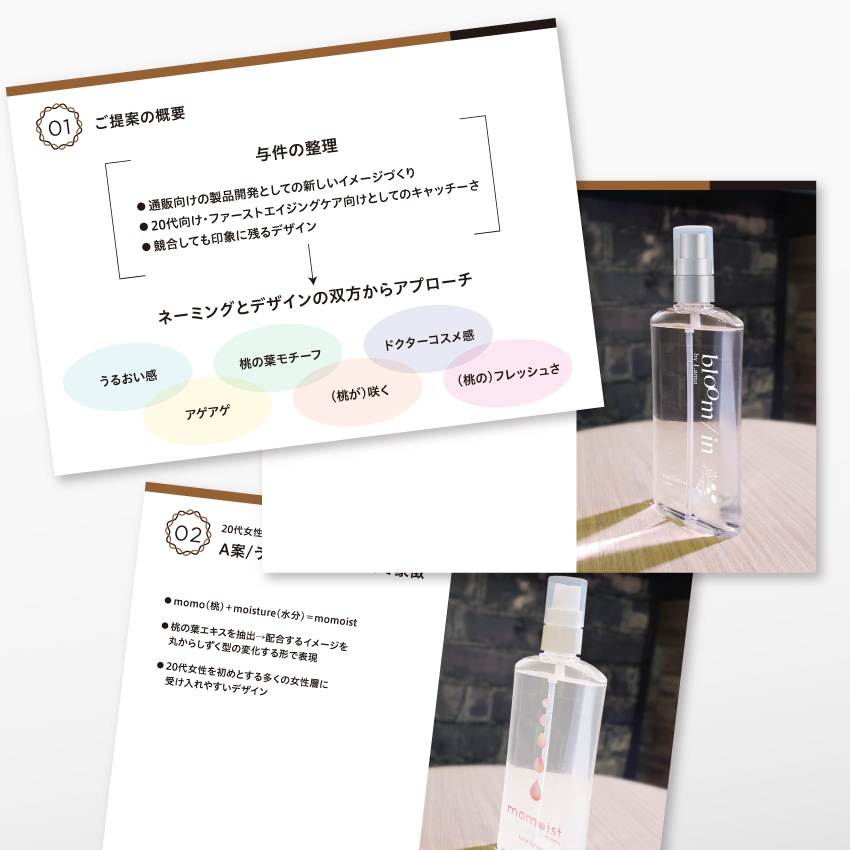 お話を伺っていると、新たな製品の成分やコンセプトは固まってきたものの、製品名やメインカラー、ロゴデザインなどはまだ全然イメージできていないということだったので、その辺りをお客様だけで決めるよりは、こちらから複数案提案を出して一緒にブラッシュアップする方向で進めてはどうかと言ってみると、ぜひそれで、ということで着手することになりました。今回は20代前半がメインターゲットでありワッカデザインのメンバーは多くが30代のため、まずは@コスメやソニープラザなどで市場調査するところから始め、社内でブラッシュアップを行ったのち、大きくは2方向、デザインバリエーションはそれぞれ3案ずつの提案書でもってプレゼンを行いました。