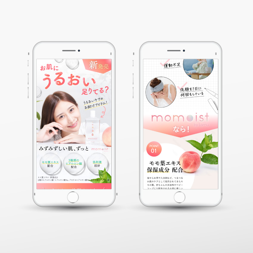 製品完成のスケジュールからこの手の案件では撮影が順番的に遅くなることが多いため、撮影出来次第ランディングページやチラシのビジュアル部分は差し替えます。今回は桃の葉エキスがポイントなので、なるべく形の良い本物の桃とターゲット層に合わせたモデルを合わせて撮影しました。ここまで来るといよいよ製品が世の中に出回る日も近いんだなぁと実感も湧いてきます。