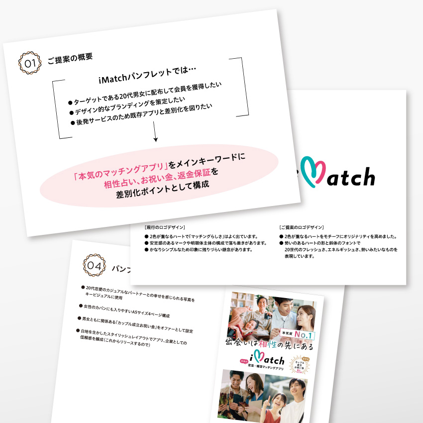 僕が20代の頃は「恋活」も「婚活」という言葉もなく、そもそもマッチングアプリがどういうものか、他のアプリはどういう打ち出し方をしているのかを調べるところから今回の提案づくりは始まりました。今回のように20代がメインターゲットの場合、特にそのデザイン的な価値観はきちんと理解しないとすぐミスマッチになりがちなので、一旦「自分」という価値観を捨てて、情報誌や女性誌を一通り読み比べたり、雑貨屋や流行のショップを見てみたり、とにかく「今」の空気を掴むための努力に時間と労力を費やします。そこから最初に導かれた結論が、既存のロゴのブラッシュアップ提案とメインとなるキャッチコピーの開発から行うことでした。
