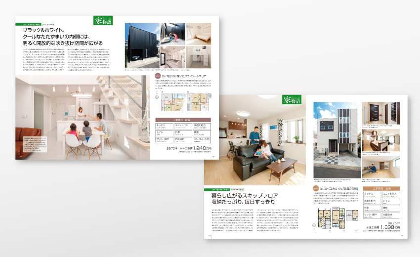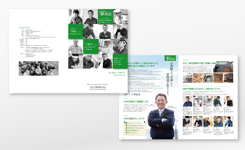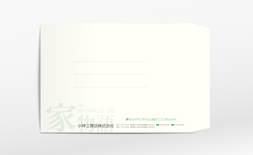 埼玉県で年間50棟以上コンスタントにこなす地域密着型の工務店の会社案内一式をてがけました。大手よりも地元の工務店を選ぶ理由は様々あると思いますが、社員や職人の人柄によるところも大きく、少しでもそういった仕事ぶりが伝わるよう心がけてデザインしています。封筒はクリーム色がかった肌触りの良いレイド(横縞)の入った紙を選択。温かみの感じられるツール一式に仕上がりました。
