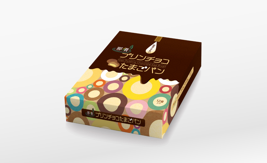 観光地でのお土産としてホテルやサービスエリア等で販売されるパッケージデザインを手がけました。たまごパンの楽しいイメージを色とりどりの円とチョコのトロッとした質感でカジュアルに表現。思わず手に取ってしまいそうなデザインを心がけました。