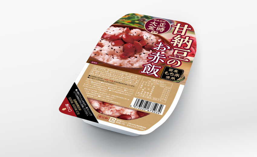 お赤飯に甘納豆を乗せたご飯製品のパッケージを手がけました。ご飯を電子レンジで加熱するスタイルはすっかり根付き、より上質な食卓のイメージ作りと栄養価の高さを感じさせるデザインを心がけています。