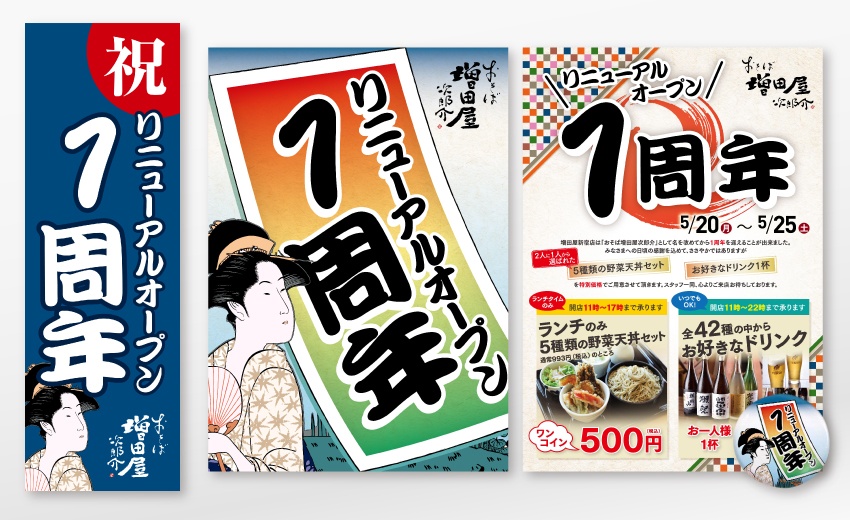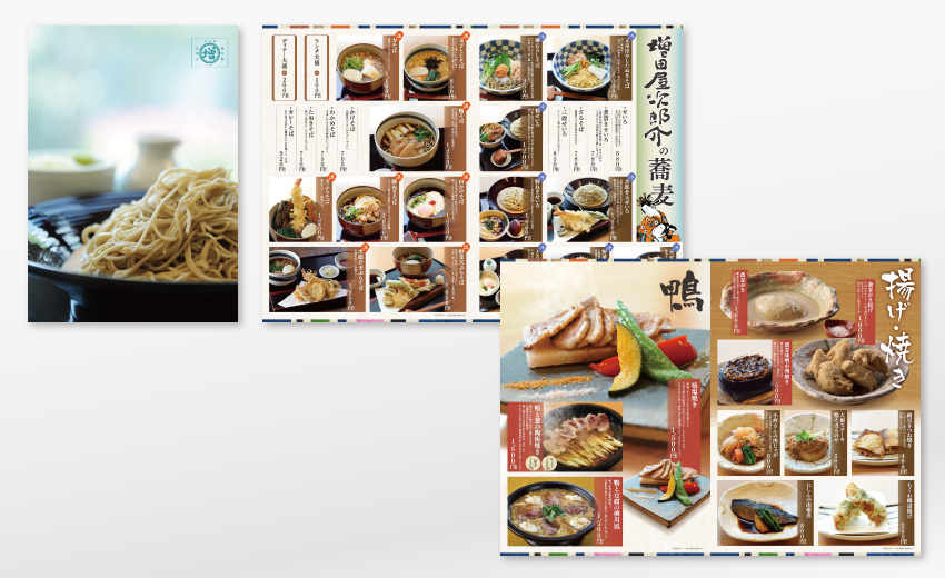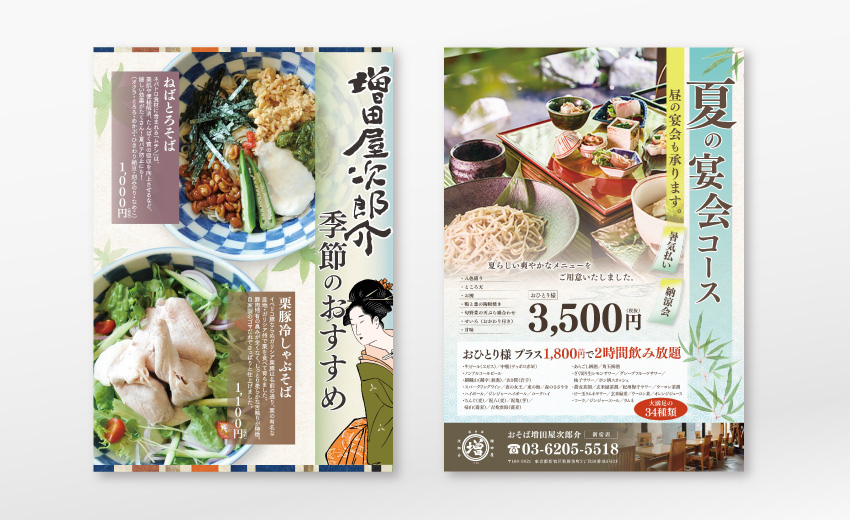 オープニングツールを手がけた老舗蕎麦店のフェアツールデザインを手がけました。その時々やフェア内容に応じたデザインを継続して行うことでお店のお客様へのイメージ定着を図り、「そのお店らしさ」を醸成することができるため、チラシ1枚でもしっかり考えてデザインすることを心がけています。