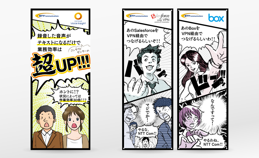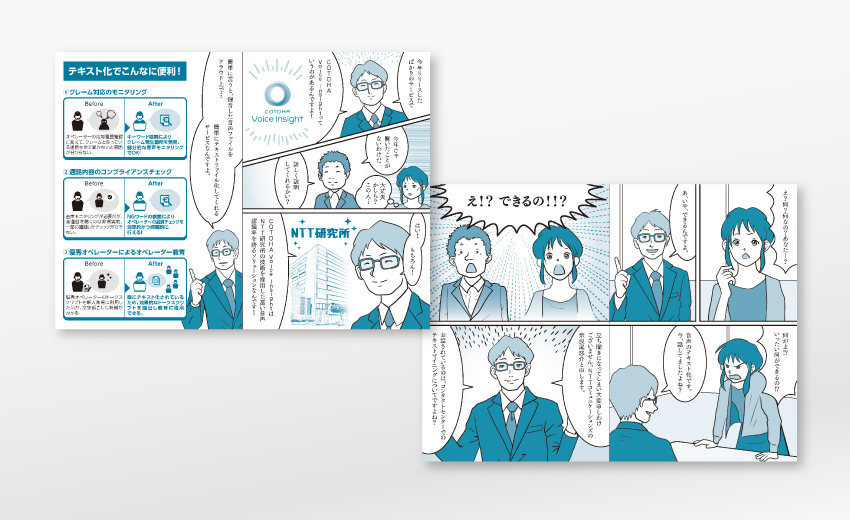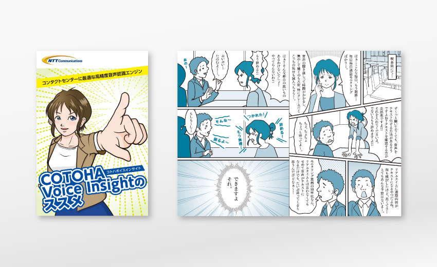 通信サービス会社におけるサービス紹介をマンガ形式で行うパンフレットを手がけました。ヒアリングを基に、ネーム作りから作画のディレクション、デザインへの展開まで一貫して行い、マンガ販促は未経験ジャンルながら3回立て続けに受注。言葉での説明が難しいものこそマンガ販促は有効であると考えています。