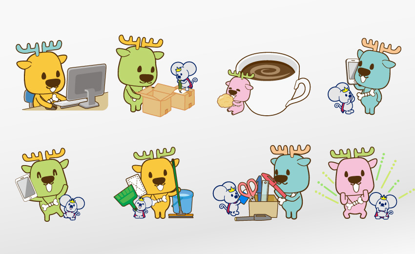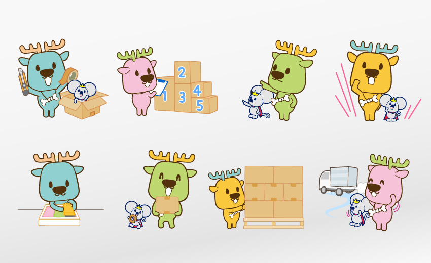 長くお付き合いのある東京都内にある梱包・発送会社のキャラクターデザインを手がけました。とは言っても急にキャラクターを作ろう!という話になったのではなく、ノベルティや販促物のデザイン制作の中で徐々に露出してきたイラストをきちんとキャラクターとしてまとめ直したのがこの頃。「ししぼねくん」と「チュー王子」はこれからも倉庫業や内職作業などを明るく楽しく見せてくれることでしょう。