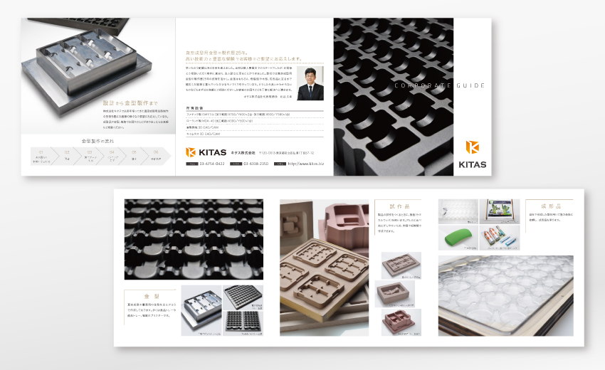 以前ロゴや名刺、Webサイトを制作させていただいた真空成型用金型制作会社の会社案内を手がけました。改めて紙のパンフレットとして作成する際は、Webで培ったイメージの共有はもちろんですが、紙モノとしての見せ方、ストーリー作りとして再構築するよう心がけています。