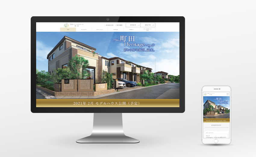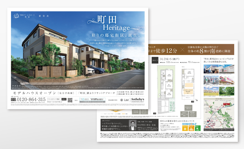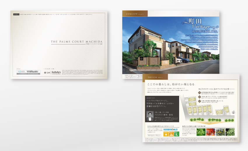 東京都の建売戸建のプロモーションツール一式を担当しました。物件の適性やターゲット層などからコンセプトワード開発から行い、ワード毎にロゴデザイン化。最終的に地域の魅力を“Heritage(遺産)”と表現したこのデザインに決定しました。