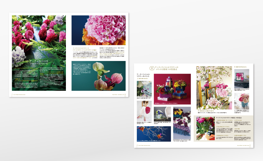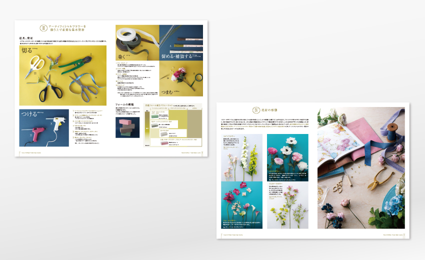 青山にあるフラワースクールのテキストデザインを手がけることが出来ました。手順を説明する際のテキストとしてはもちろん、気品のあるデザイン、レイアウトでブランディングブック的な意味合いを込めたいというオーダー。雑誌のようにただ眺めていてもその美しさが楽しめる仕上がりになりました。