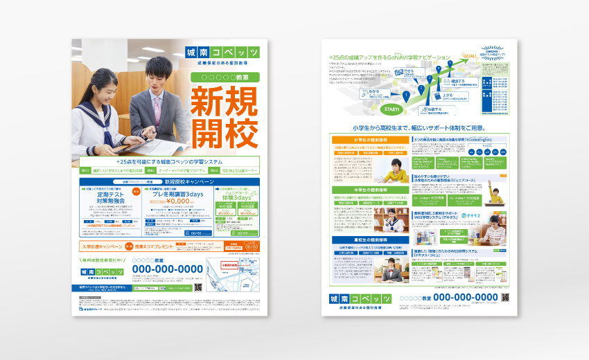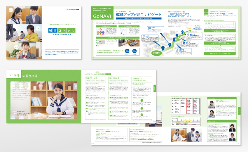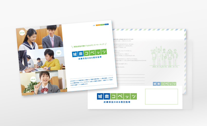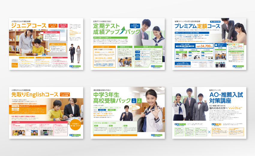 大手学習塾における販促ツールリニューアルのデザインでコンペからの受注です。各ツールの役割やその構成を見直すところから開始し、モデルを使用した撮影までフルディレクション。簡易版も含めるとパンフレット3種類、講座チラシ10種類以上、折り込みチラシフォーマット3種類など年間で使用されるツールの全てを手がけることが出来ました。