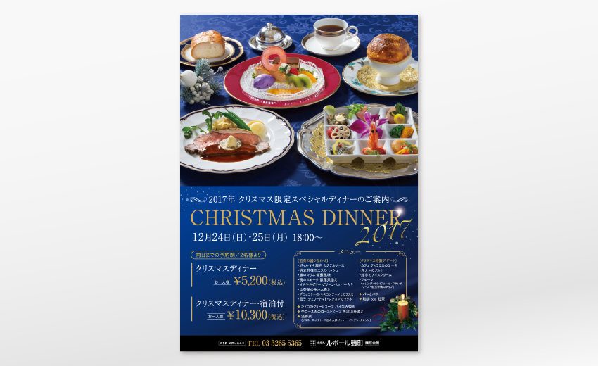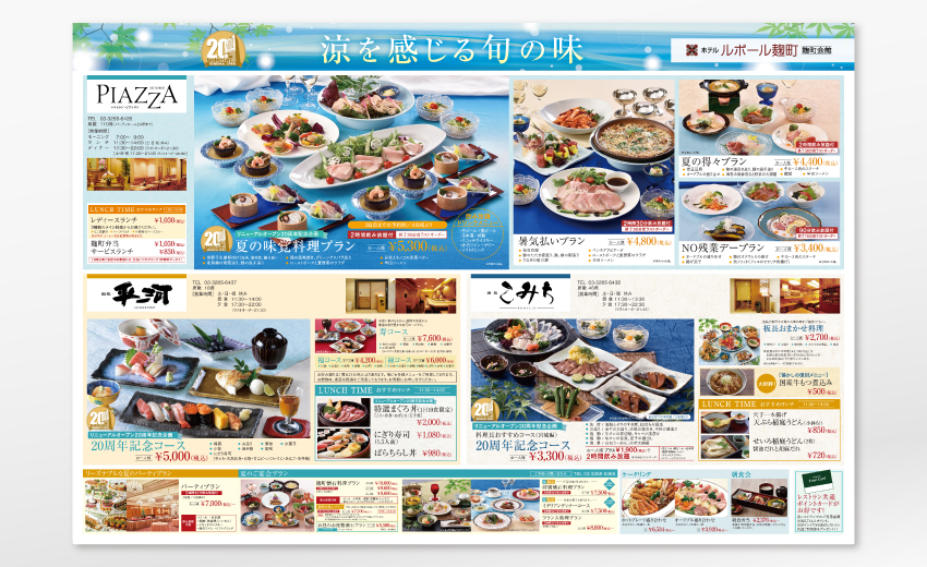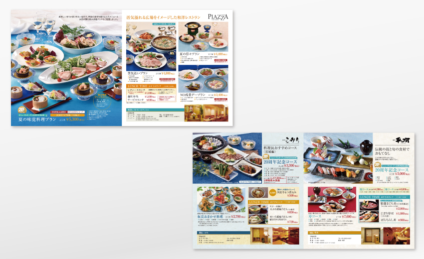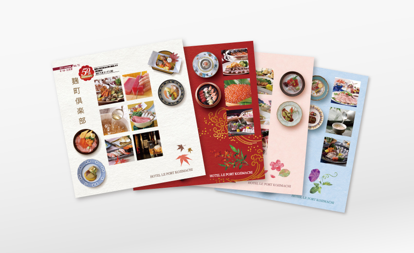 東京都心のシティホテルにおけるパンフレット、ポスター、看板、フライヤーなどを手がけています。季節性の高い見せ方にこだわるため、撮影小物のコーディネートやレタッチも含めたトータルでの撮影ディレクションを行い、当初は季刊誌のみの案件でしたが、年間を通してあらゆるツールを生まれ変わらせるに至りました。