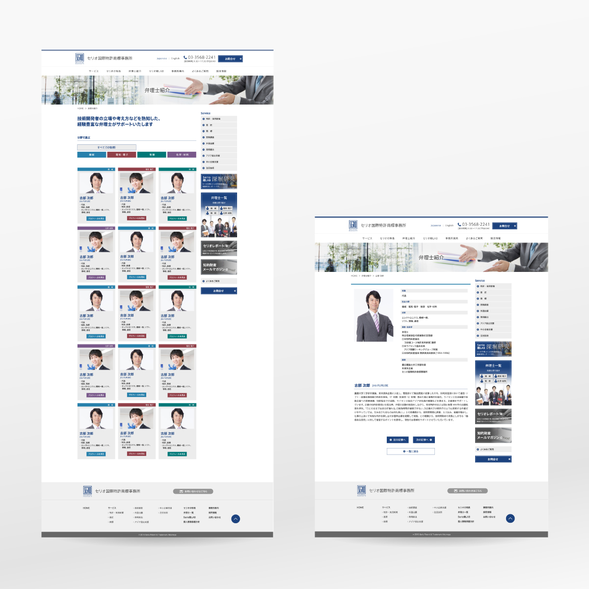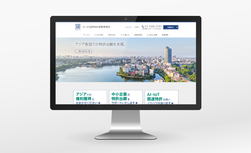国際特許と商標を生業とする弁理士事務所のコーポレートサイトを手がけました。国際特許はとても難易度が高いこともあり、クライアントから高い評価を得ている弁理士事務所のため、そのクオリティ感を保ちながら営業的なサイトにするというご要望。あまり「売り売り」にならないよう注意を払いながらデザインしています。