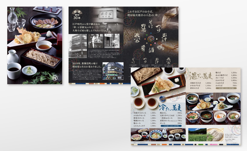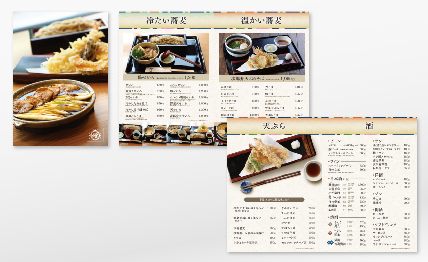 老舗蕎麦店の新業態オープンに合わせ、グランドメニューやランチメニューを初めとしたツール一式を手がけました。良い意味で個人店ならではのシズル感を大切にしたデザインに加え、特に撮影にこだわり、新業態としての印象付けを心がけています。