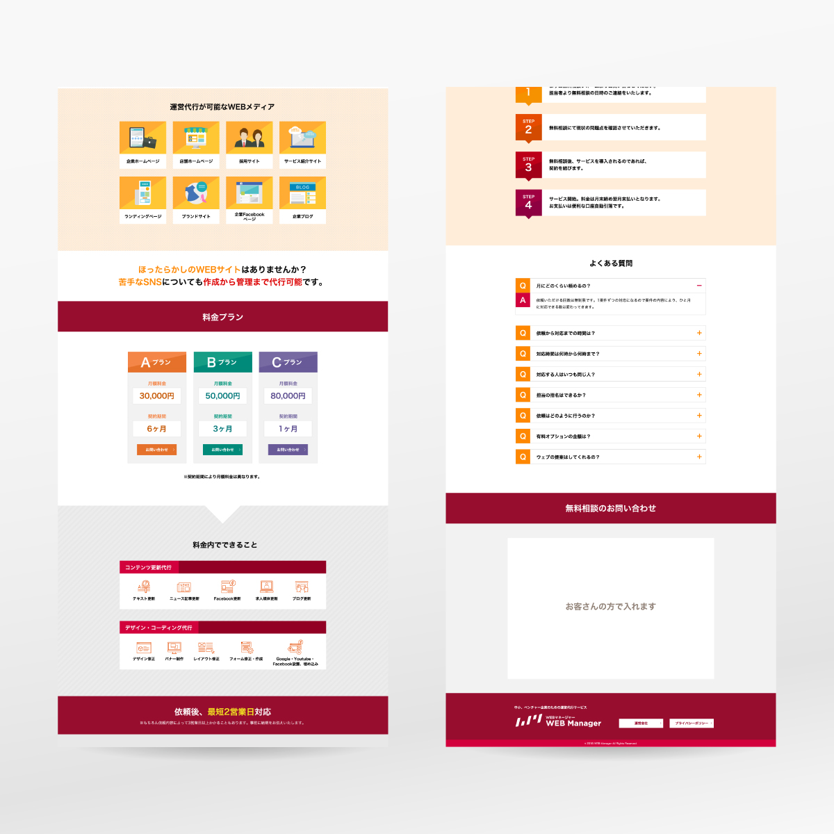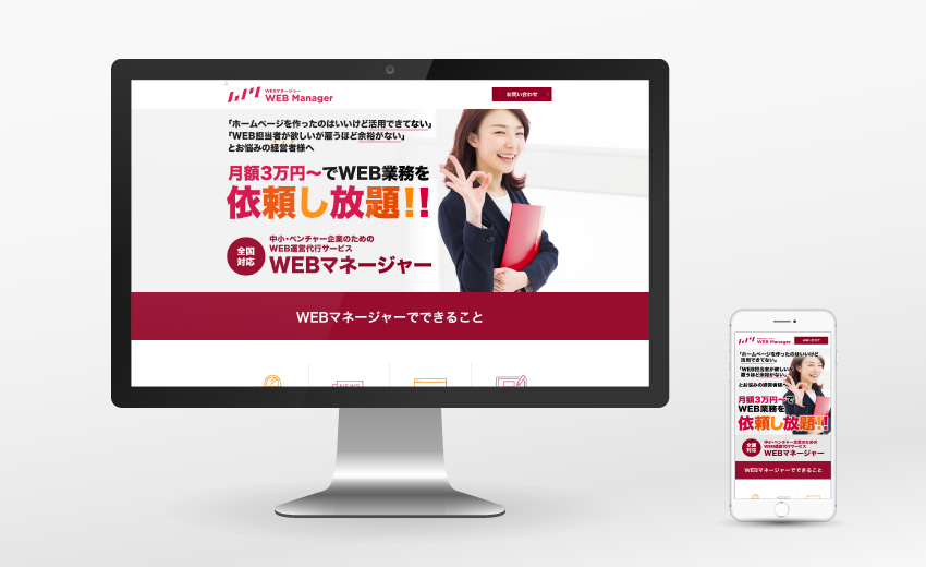 需要の増えるWebサイト管理代行サービスのLPを制作。Web担当が充分におらずこまめな更新まで手の回らない中小企業の経営層をターゲットにするため、経営にWeb戦略を活かそうという切り口で構成、デザインしています。クライアントにとっても新規事業のため、サービスロゴも手がけました。