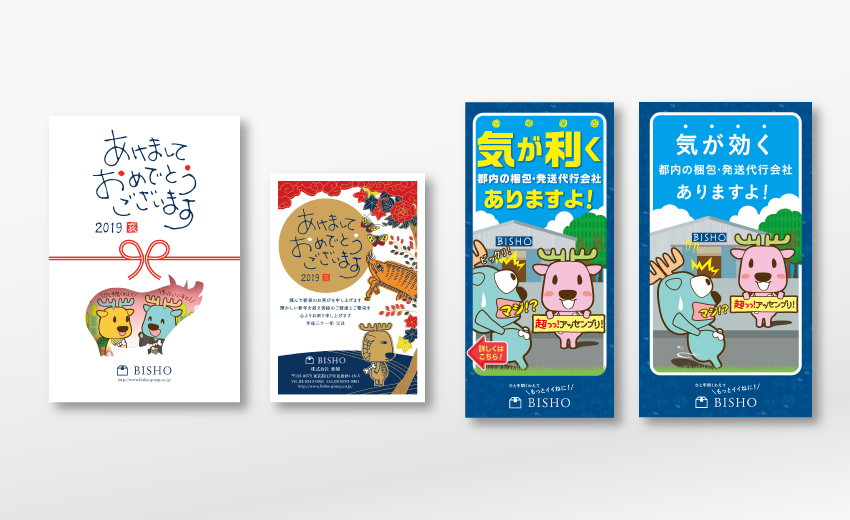 東京都内にある梱包・発送会社の販促ツール展開を年間通じて行っています。昨年と異なるのはオリジナルのキャラクターを生み出し、それに基づいて展開したこと。より一瞬の訴求力を高めたデザイン展開を行っています。