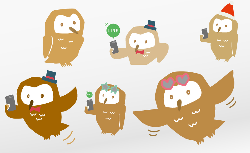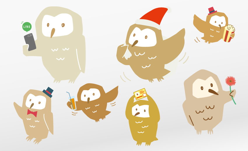いつもキャンペーンなどのデザインを行なっている商業ビルのキャラクターデザインです。当初からキャラクターとして開発したわけではなく、池袋にちなんで何となく入れていたのが、こちら側でもお客さん側でもだんだんと愛着が出てきて、毎回使うようになりました。周りのデザインに合わせて色が毎回微妙に違うのと、スマホから応募のキャンペーンが多いのでスマホをいじることの多いフクロウです(笑)