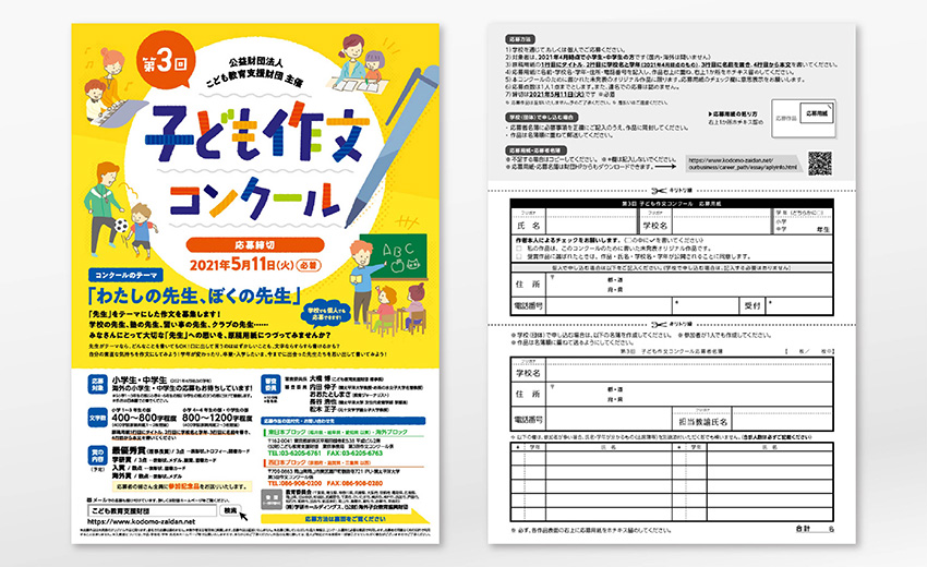 東京都に拠点を置く小学生や中学生、高校生向けの支援をしている公益財団法人のデザインを手がけています。学校向けの各種コンクールやノベルティ、タブロイド紙など、多くのツールがある中で、最も見せ方を気にするのがこういったコンクールのデザイン。自分も応募したくなるような気持ちを大切にデザインしています。