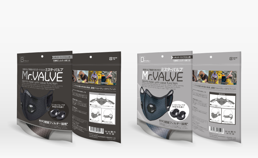 オリジナルで開発されたバルブ付きマスクのパッケージデザインを手がけました。コロナ禍にあってマスク需要が高い中、バルブによって呼吸を楽にすることができるマスク。テクノロジーとスマートさを感じさせることで、オリジナリティある製品の価値を訴求する狙いのデザインとなっています。