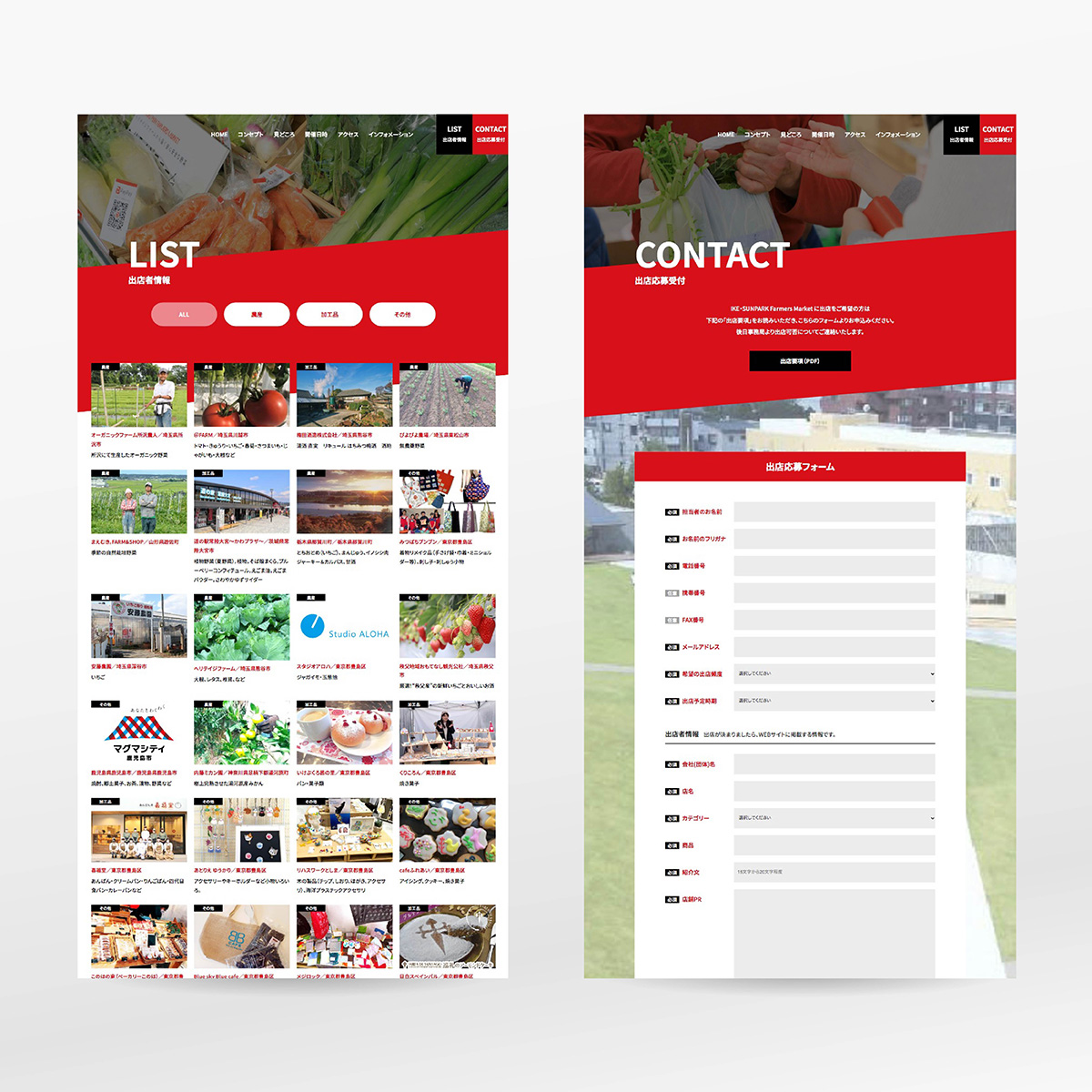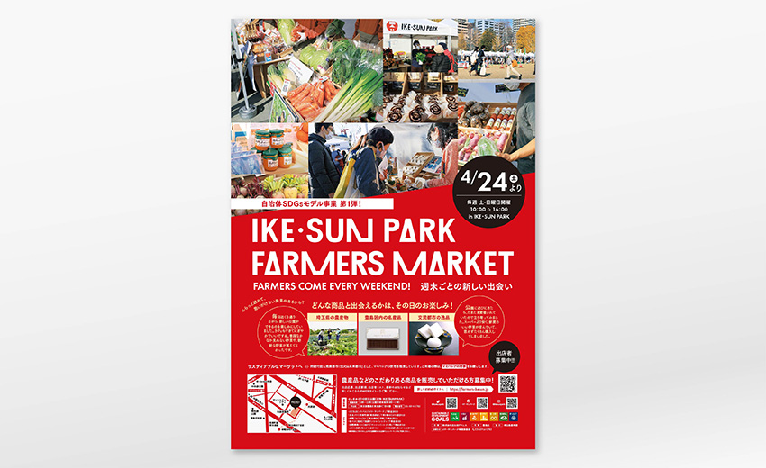 池袋にあるイケ・サンパークで毎週末開催される「ファーマーズマーケット」のWebサイトとチラシ、ポスターのデザインを手がけました。キーカラーのレッドで鮮烈な印象を与えると同時に、マーケットの期待感や息遣いを感じられるデザインを心がけました。紙でもWebでも媒体やレイアウトは違えど同じブランディングイメージで展開しています。