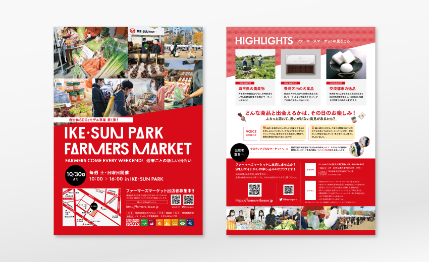 池袋にあるイケ・サンパークで毎週末開催される「ファーマーズマーケット」のWebサイトとチラシ、ポスターのデザインを手がけました。キーカラーのレッドで鮮烈な印象を与えると同時に、マーケットの期待感や息遣いを感じられるデザインを心がけました。紙でもWebでも媒体やレイアウトは違えど同じブランディングイメージで展開しています。