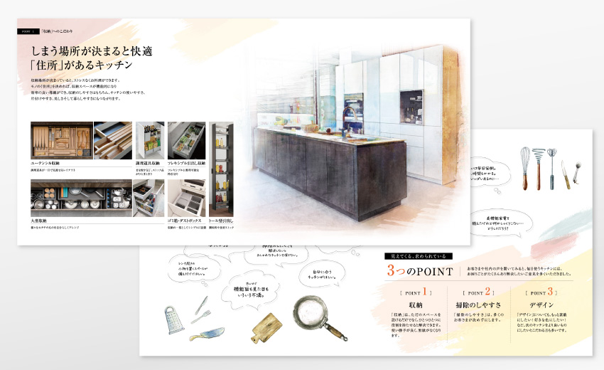 高級マンション等に卸される住宅設備メーカーのブランディングブックを制作しました。最初にお声がけいただいてから約2年、一人一人が様々な思いで働く会社の中で「ブランディング」という共通メッセージを形作るのがいかに難しいかを体感するような仕事でしたが、手に取ってくれた方に自然と問いかけるような構成、弊社代表の独特のイラスト手法を用いたりするなど、ワッカデザインでないとできないブックに仕上がったと思っています。