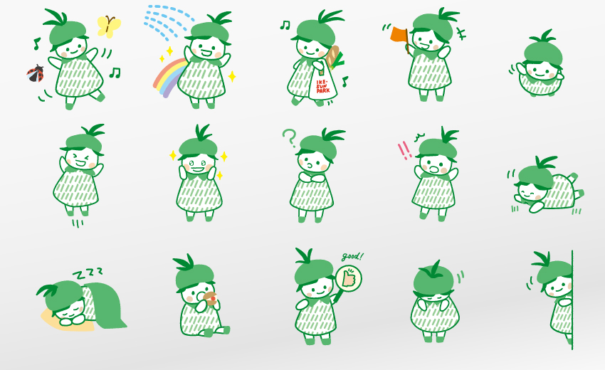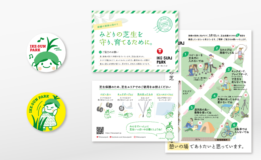 豊島区の都心型公園「IKE・SUN PARK」のキャラクター開発を手がけました。注意書きや啓蒙活動のようなことも多いため、多くの人に愛されるキャラクターを心がけ、各種ツールやノベルティ等に表情豊かに登場させることで、公園の雰囲気向上に一役買っています。