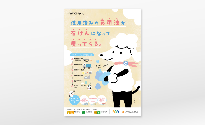 食品メーカーのSDGsにおける取り組みを啓蒙するポスターを制作いたしました。石けん=ソープ+プードルという具合にキャラクターにすることで、食用油から石けんに作り変える様がわかりやすいイラストになり、親近感あふれるデザインに仕上がっています。