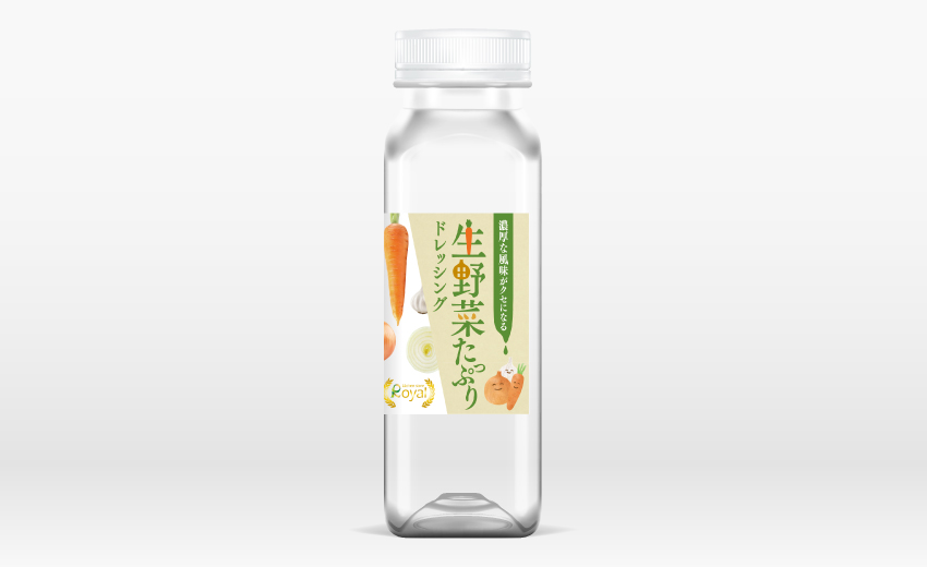 食品メーカーはオリジナルで開発されたサラダドレッシングのパッケージデザインを手がけました。地元の有名なイタリアンのシェフに監修して開発されたレシピで、野菜がとても美味しくいただけるドレッシング。食卓が楽しくなるイメージでデザインしています。