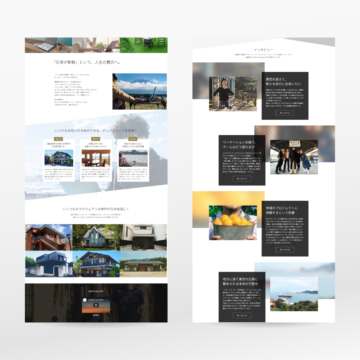 二拠点居住やデュアルライフ、ワーケーションのサポートをするサービス“wataridori”のwebサイトを制作しました。スタートアップでの制作のため訴求点の洗い出しやコンテンツの作成から全面的に手がけ、今後長期間に渡るブランディングやトーン&マナー策定も意識したデザインになっています。