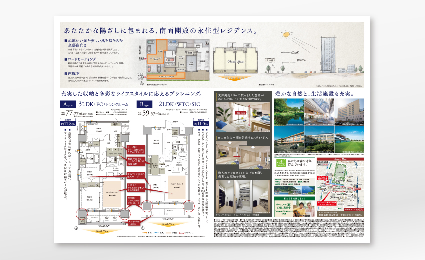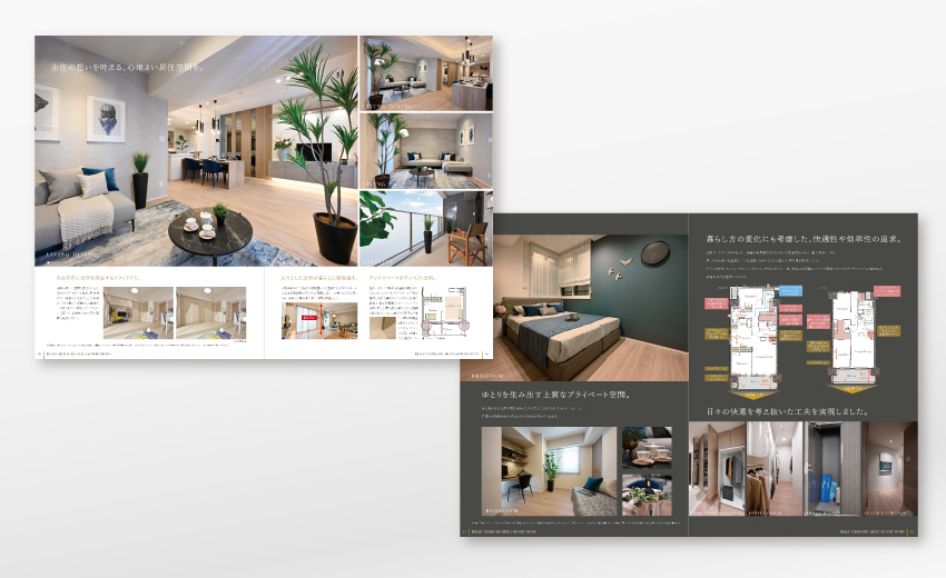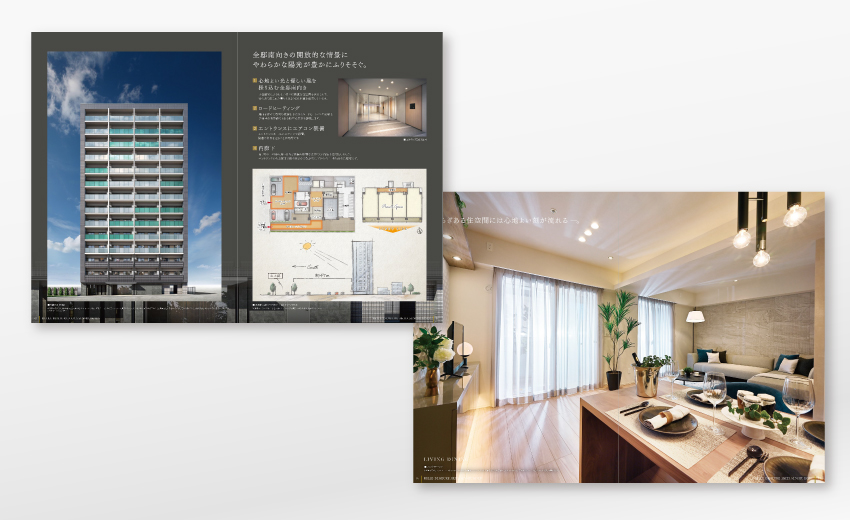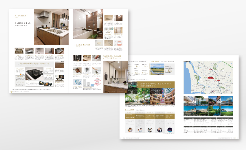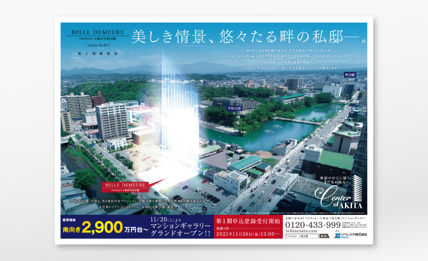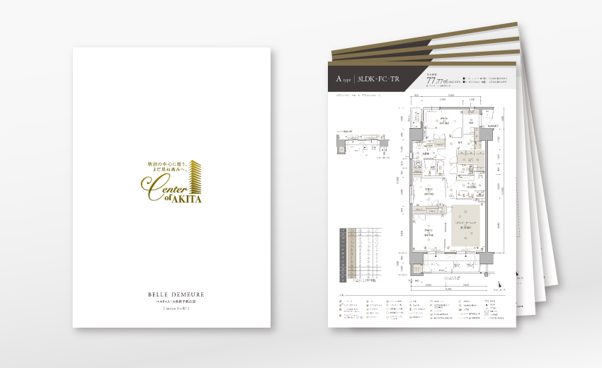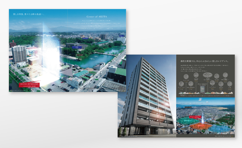 秋田県の新築マンションのプロモーションツール一式を担当しました。コンセプトワードの策定とコンセプトロゴが表現のメインとなりますが、物件の適性やターゲット層などからコンセプトワード開発から行い、ワード毎にロゴデザイン化。最終的に物件の姿・眺望と立地の良さを表現したこのデザインに決定しました。