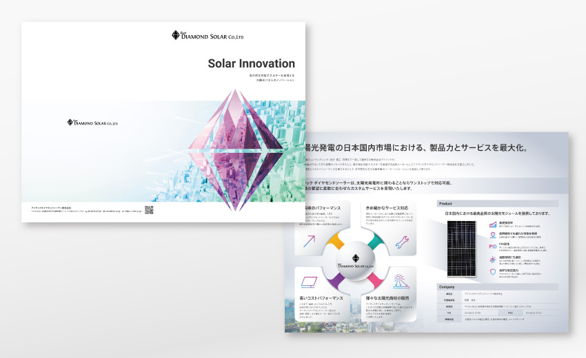 太陽光パネルの日本国内メーカーにおけるサービス案内を手がけました。1年ほど前に会社立ち上げ時のWebサイトを制作しており、その時に構築したトーン&マナーを継承しつつ、紙のツールならではのレイアウトとしてデザインしています。キービジュアルがWebと紙に展開されるとブランディングを複合的に感じることができ、伝達力が増していくのを実感します。