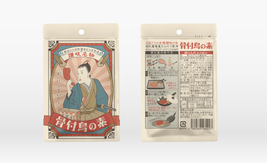 香川県で飲食店を経営する会社からオリジナルスパイス調味料のパッケージデザインをご依頼いただきました。香川というと讃岐うどんのイメージが強いですが、地元では骨付鳥というソウルフードが根付いており、家庭でも気軽に食べれるようにとの思いから製品化されたそうで、食べてみたらこれが非常に美味しい!平賀源内をモチーフにした浮世絵テイストのインパクトあるパッケージデザインで、骨付鳥がさらに広まることを願っています。