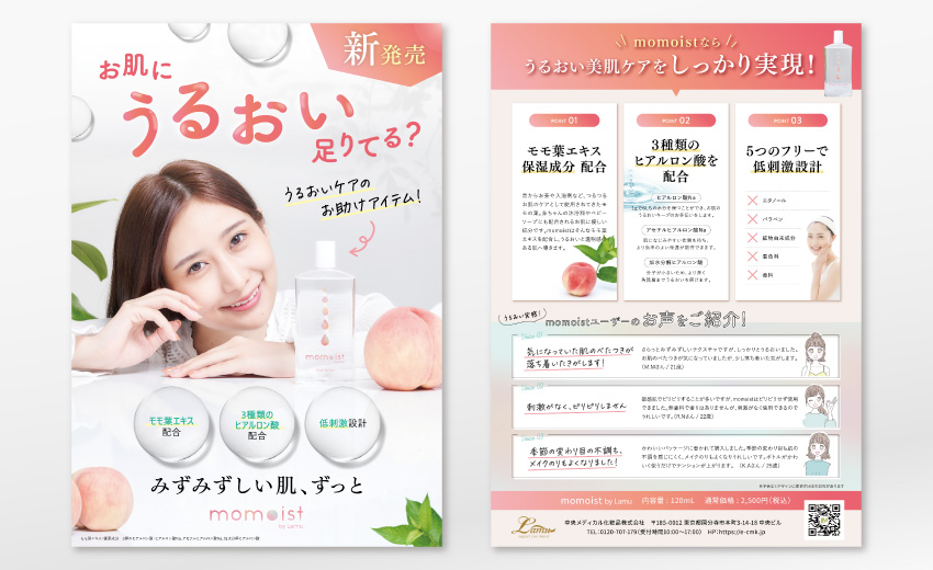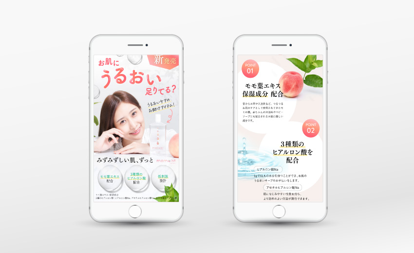 美容クリニックで主に使われている化粧品メーカーのBtoC向け新製品のデザイン一式を手がけました。20代女性ターゲットとしてネーミングからパッケージデザイン、LPデザイン、フライヤーデザインまで一貫して制作。出来上がってみると桃の葉エキス配合の軽やかなテクスチャ感が気持ちいい美容液なので、一つでも多く売れるよう願っています!