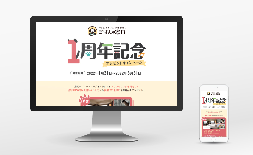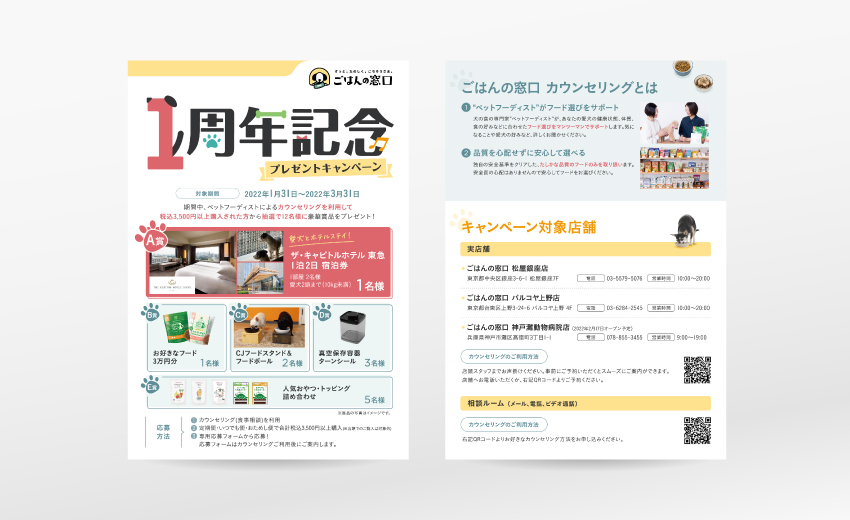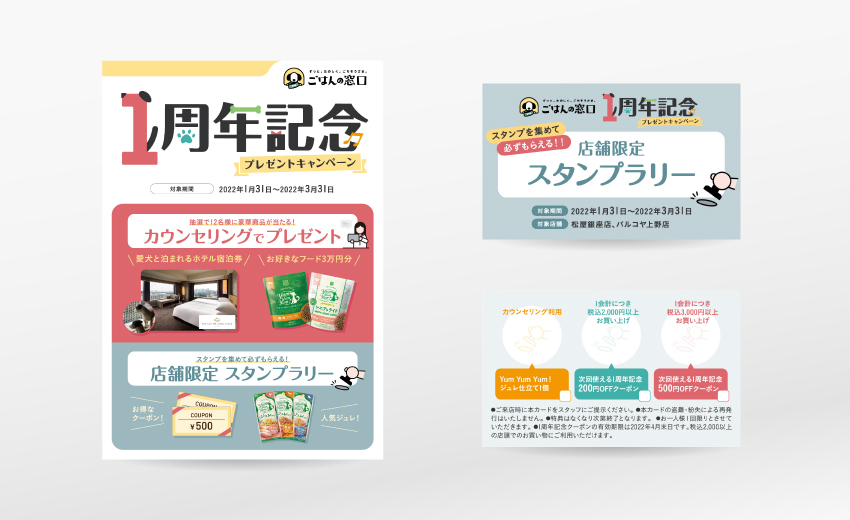 ペットフードのコンサルティングに注力するペットフードショップの1周年キャンペーンデザインを手がけました。依頼自体はチラシ、POP、スタンプカード、Webサイトを一括して制作したいというあっさりした感じだったのですが、周年記念といえども販売キャンペーンではあるので、店内POPあるいはWebバナー等でも視認性の高いタイトルデザインを手がけることに注力。上品なトーン&マナーを守りつつ様々なシーンで目を引くSPツールデザインに仕上がりました。