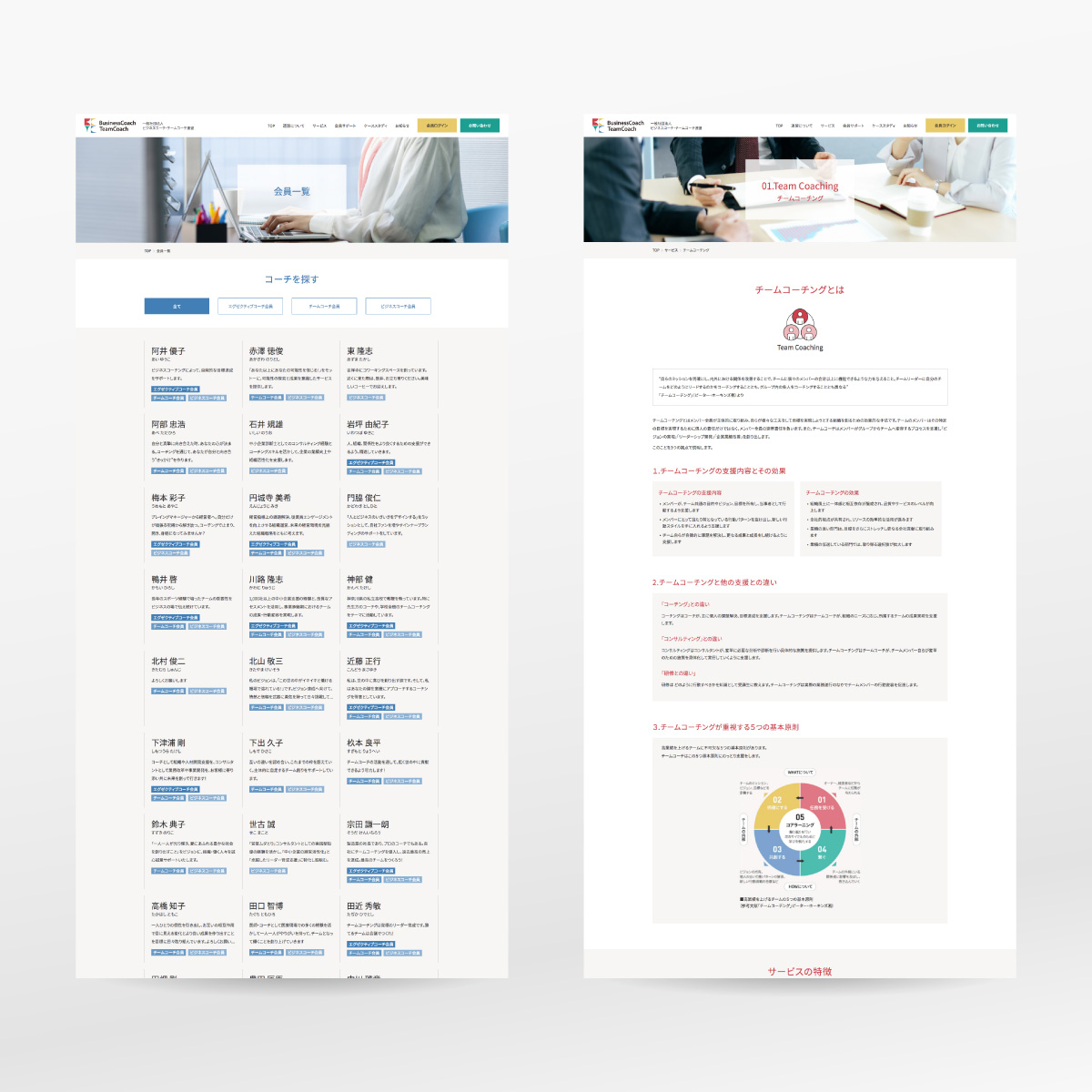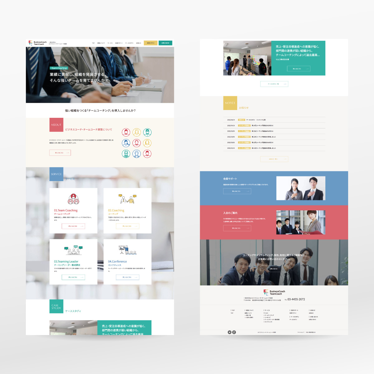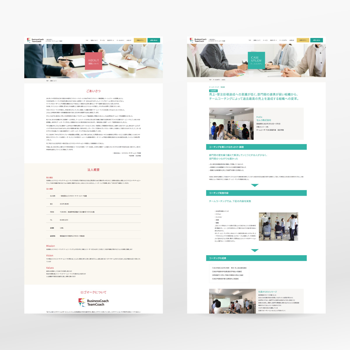 経営者のリーダーシップのためのビジネスコーチングを支援する一般社団法人のWebサイトを制作。ロゴから開発したことによりブランディングとして4色のトーン&マナーを策定しつつ、奇を衒わないビジネストーンの洗練されたレイアウトでまとめています。WordPressで会員ログイン機能、ファイル共有ページ、チャット機能を実装しています。