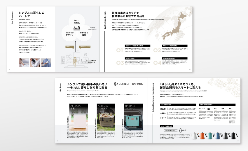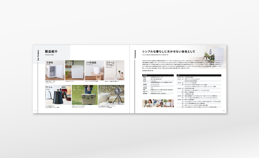 「シンプルな暮らし」をモットーとする家電メーカー様の会社案内を手がけました。高品質でありながら、無駄を削ぎ落とすことで低価格を実現しているメーカーの姿勢と期待感をシンプルなレイアウトでスタイリッシュに表現。これでロゴ、Webサイト、会社案内が一通り揃い、ますますビジネスフィールドは広がっているようです。