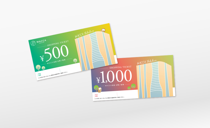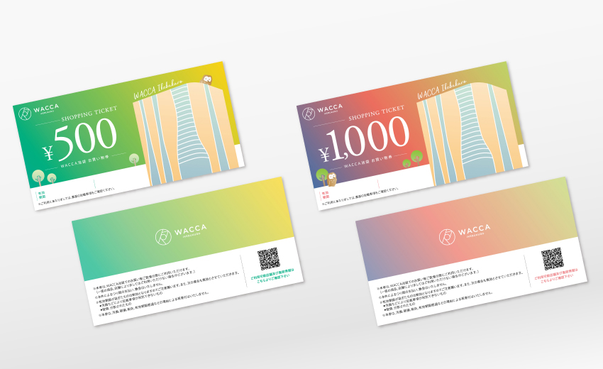 地元・池袋にある商業ビルのお買い物券デザインのリニューアルを手がけました。いかにも金券然としていたそれまでのデザインに対し、方向性違いで提案した中から選ばれたのは、色合いのビビッドなお買い物券でした。ワッカデザインが関わるようになってからたびたび登場するフクロウも入って、とても新鮮なお買い物券に仕上がっています。