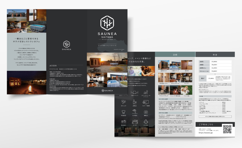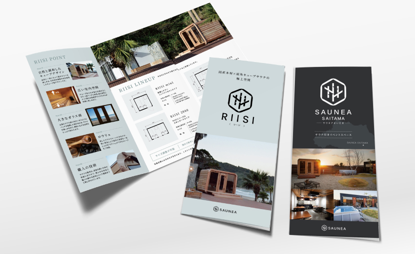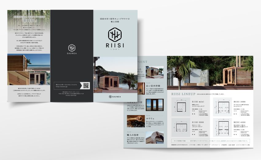 フィンランド式アウトドアサウナを独自に設計、製造販売しているサウナメーカーのリーフレット一式を手掛けました。Webサイト制作を先行して進めていたため、内容はそちらから紙のリーフレットの構成に落とし込み直す形でデザイン。製品案内と体験施設案内の2種類で使いやすいように提案しています。また撮影した写真を使ってポストカードも制作。”アウトドアサウナ”という新しい価値観の醸成をお手伝いしています。