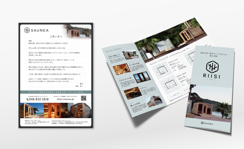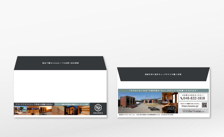 フィンランド式アウトドアサウナを独自に設計、製造販売しているサウナメーカーのDM一式を手掛けました。興味のありそうな業界と企業をリストアップして、封筒の表面からも問いかけるような構成でDMと挨拶状をデザイン。先日作ったばかりの製品リーフレットも同梱しています。DMはターゲティングを明確にすることで、その構成や訴求内容を彼らに宛てたものとして作ることがとても大事。ワッカデザインではそうした企画面からサポートしています。