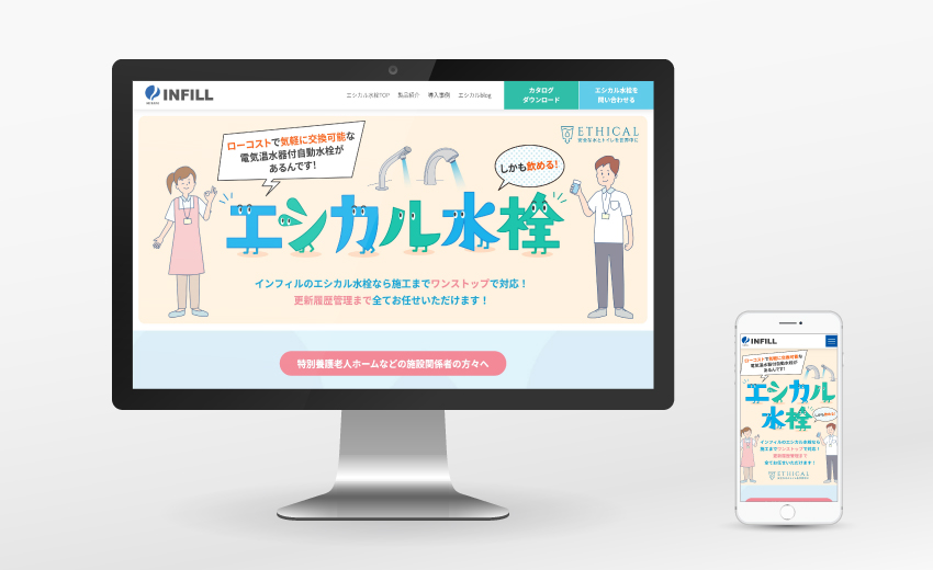 福祉施設向け設備メーカーのプロジェクトサイトを制作しました。以前制作したスタイリッシュなイメージの本体サイトとは異なり、ユーザーへの訴求力を重視してイラストや動画、blogなどでカジュアルに演出。本体サイトのコンテンツとして構築することで、今後行うコンテンツSEOに適合した作りになっています。