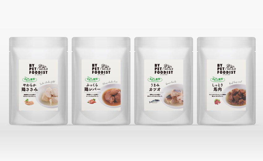 食材の味を活かしたペットフードシリーズのパッケージデザインを手掛けました。人も食べられるヒューマングレードな品質感と素材をそのまま使っているイメージをスタイリッシュにレイアウトすることで、伝わりの良いパッケージに仕上がっています。