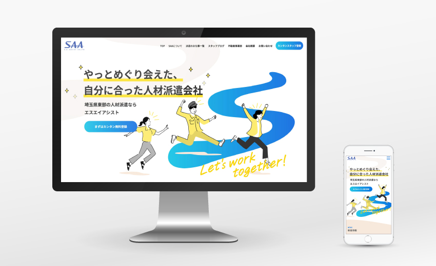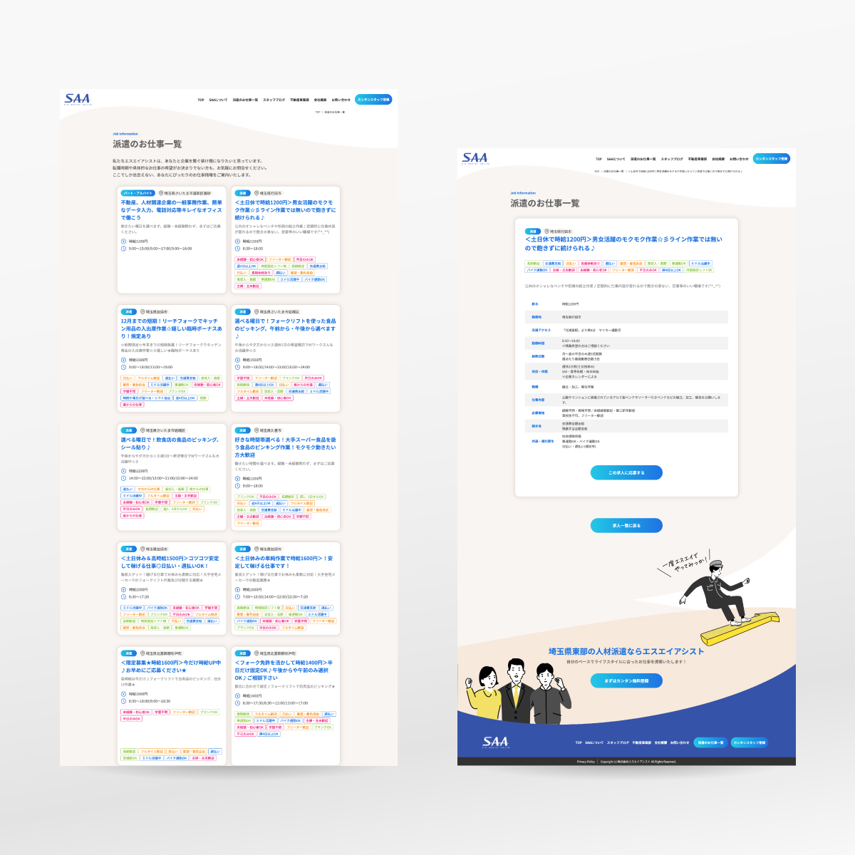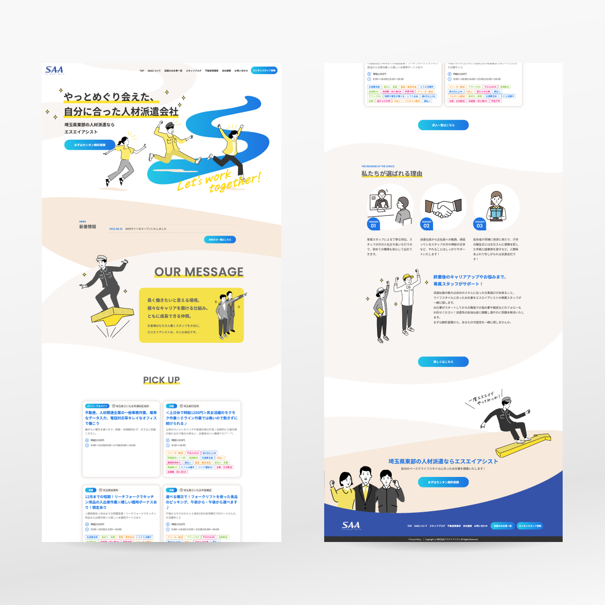 埼玉県を中心に人材派遣を行う会社のWebサイトを手掛けました。よくある派遣会社のトーンではなく、自分達ならではの取り組みを踏まえたサイトづくりを行なって欲しいとの要望のもと、人柄とエピソードを見た目にも感じさせるイラストをメインに構成。投稿コンテンツを工夫することで求人情報も網羅しつつ、応募のしやすい構築となっています。