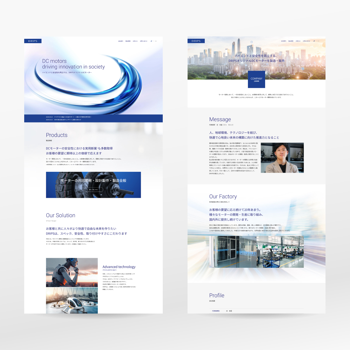 独自の精密なモーターを企画・製造するメーカーのWebサイトを手掛けました。スタートアップであり、シンプルな構成ながら、大手メーカーにも採用される製品品質の高さを感じさせるビジュアルとトーン&マナーを心がけています。海外展開も視野に入れ、日本語・英語切り替え機能も搭載しています。